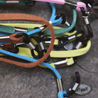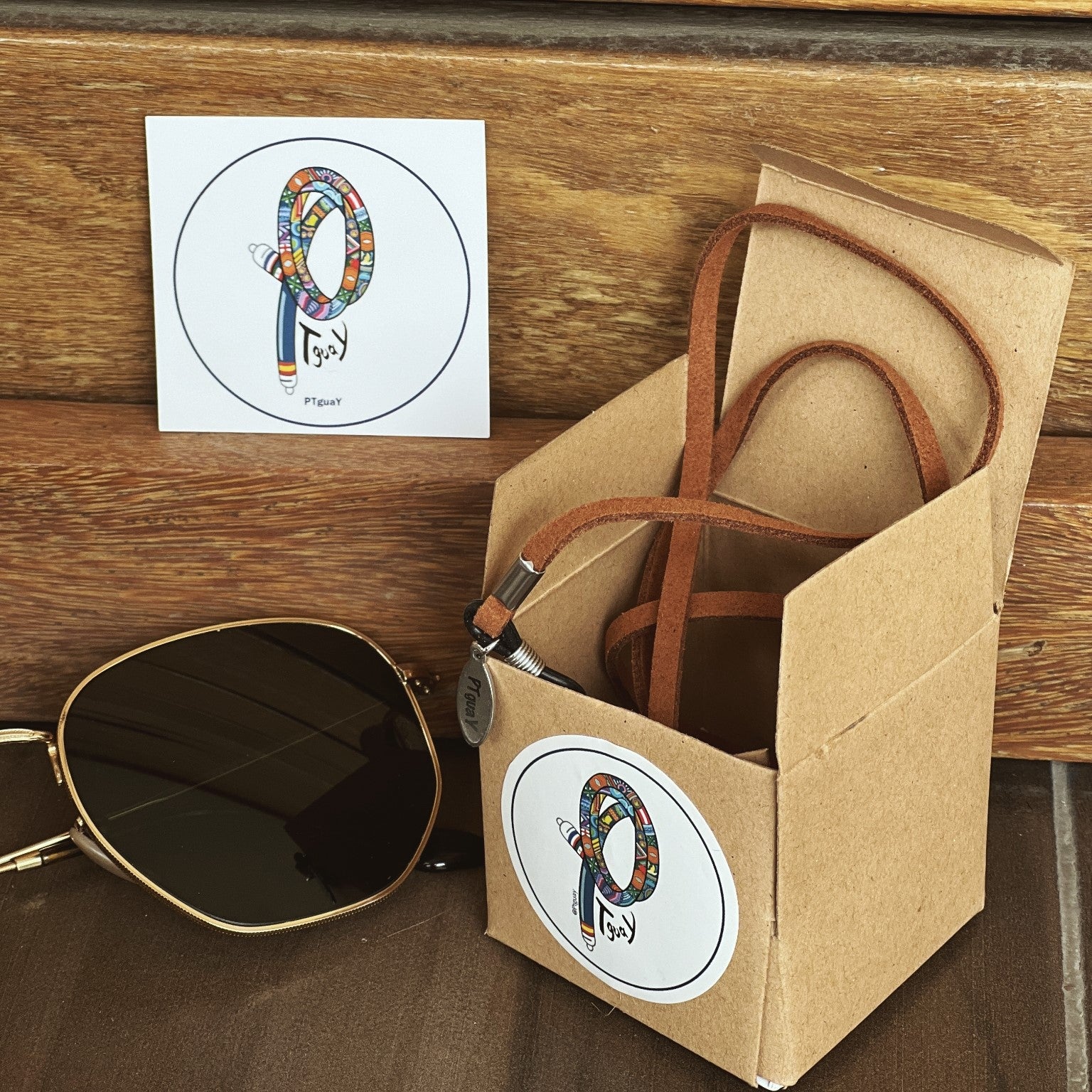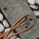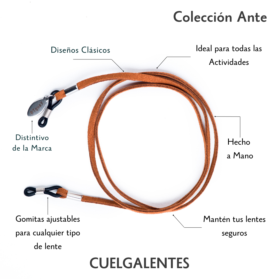 Nuestros cuelgalentes Ante están hechos a mano, de gamuza con una terminación en plata y unas gomas elásticas que permiten ajustar el cuelgalentes a cualquier tipo de varilla. Además, cuenta con un distintivo de plata con el nombre de la marca.