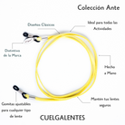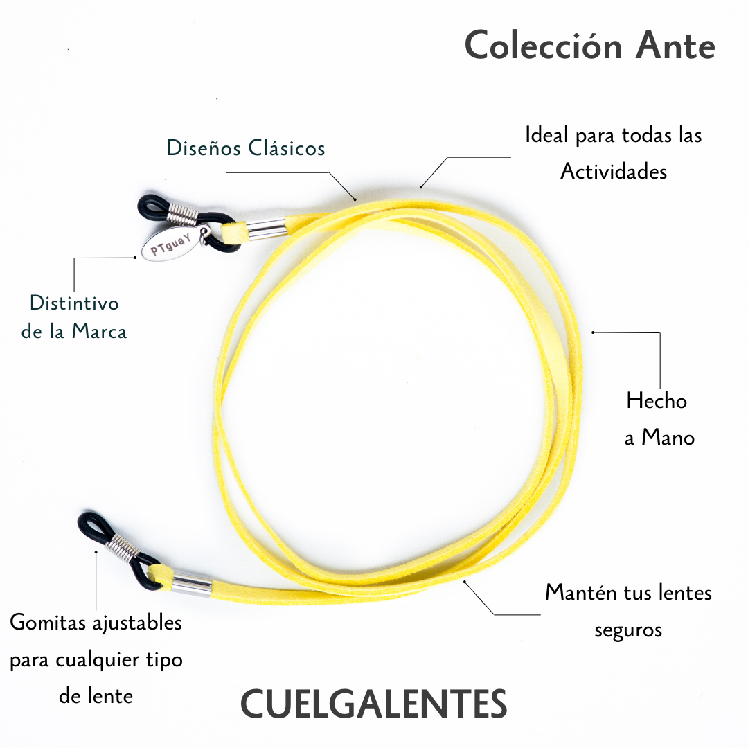 Nuestros cuelgalentes Ante están hechos a mano, de gamuza con una terminación en plata y unas gomas elásticas que permiten ajustar el cuelgalentes a cualquier tipo de varilla. Además, cuenta con un distintivo de plata con el nombre de la marca.