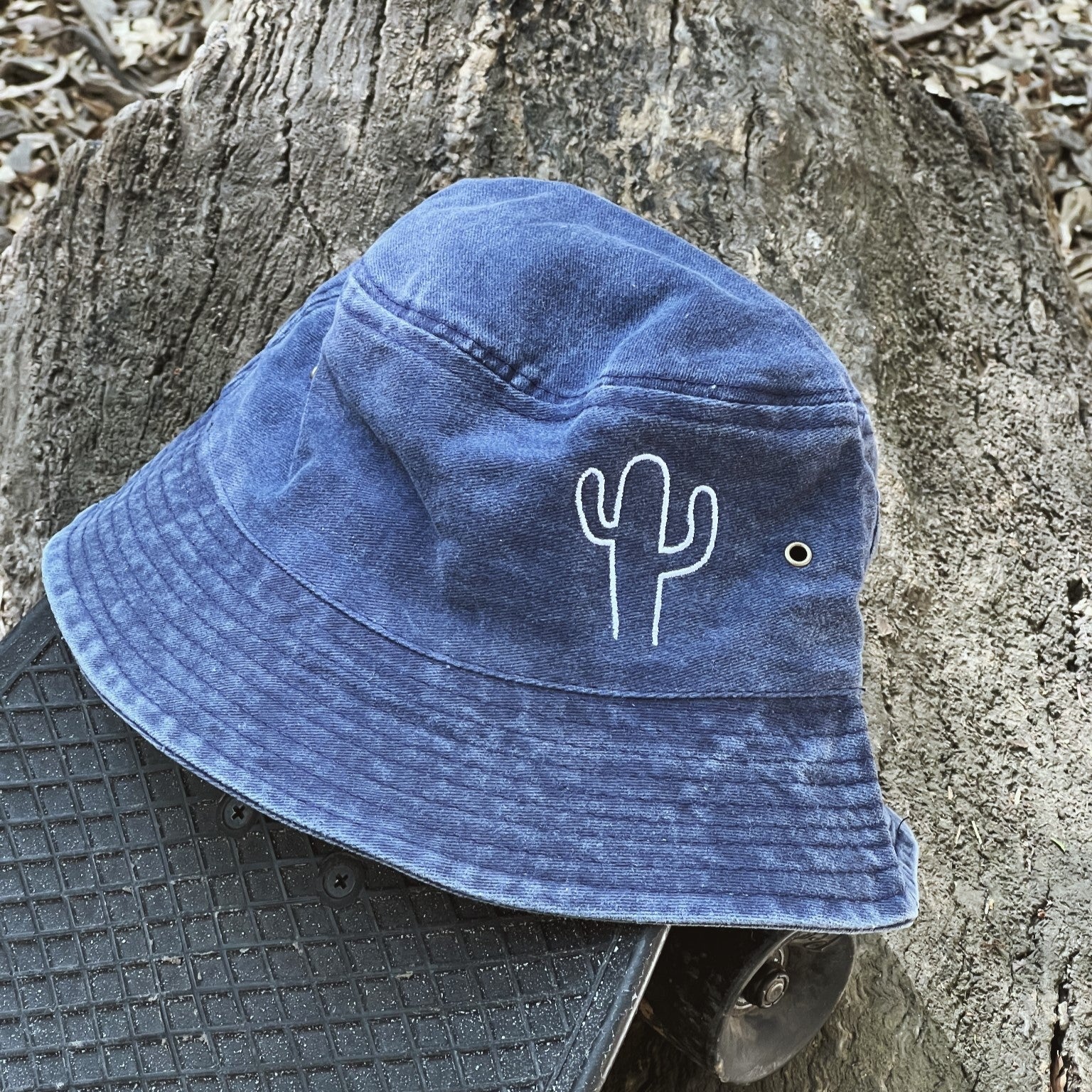 Nuestro bucket hat de la colección Cactus color azul marino tiene un diseño tipo "desgastado" y cuentan con dos bordados en color blanco. El primero es un cactus en la parte delantera izquierda y el segundo es el nombre de la marca en la parte trasera derecha y en pequeño.