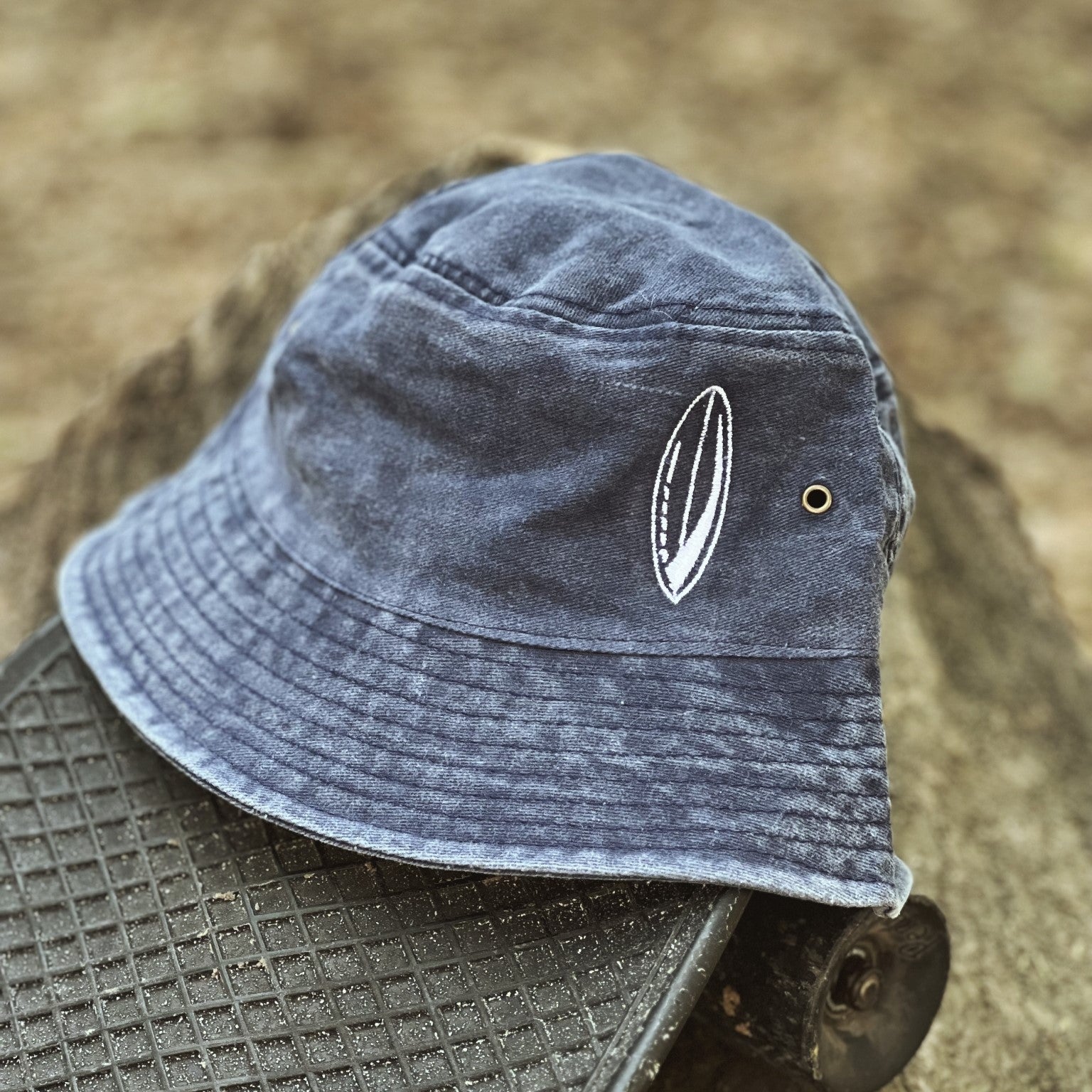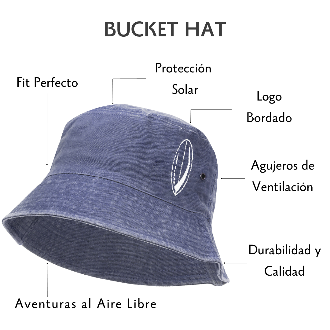 Nuestro bucket hat de la colección Tabla de Surf color azul marino tiene un diseño tipo "desgastado" y cuentan con dos bordados en color blanco. El primero es el logo de una tabla de surf en la parte delantera izquierda y el segundo es el nombre de la marca en la parte trasera derecha y en pequeño.