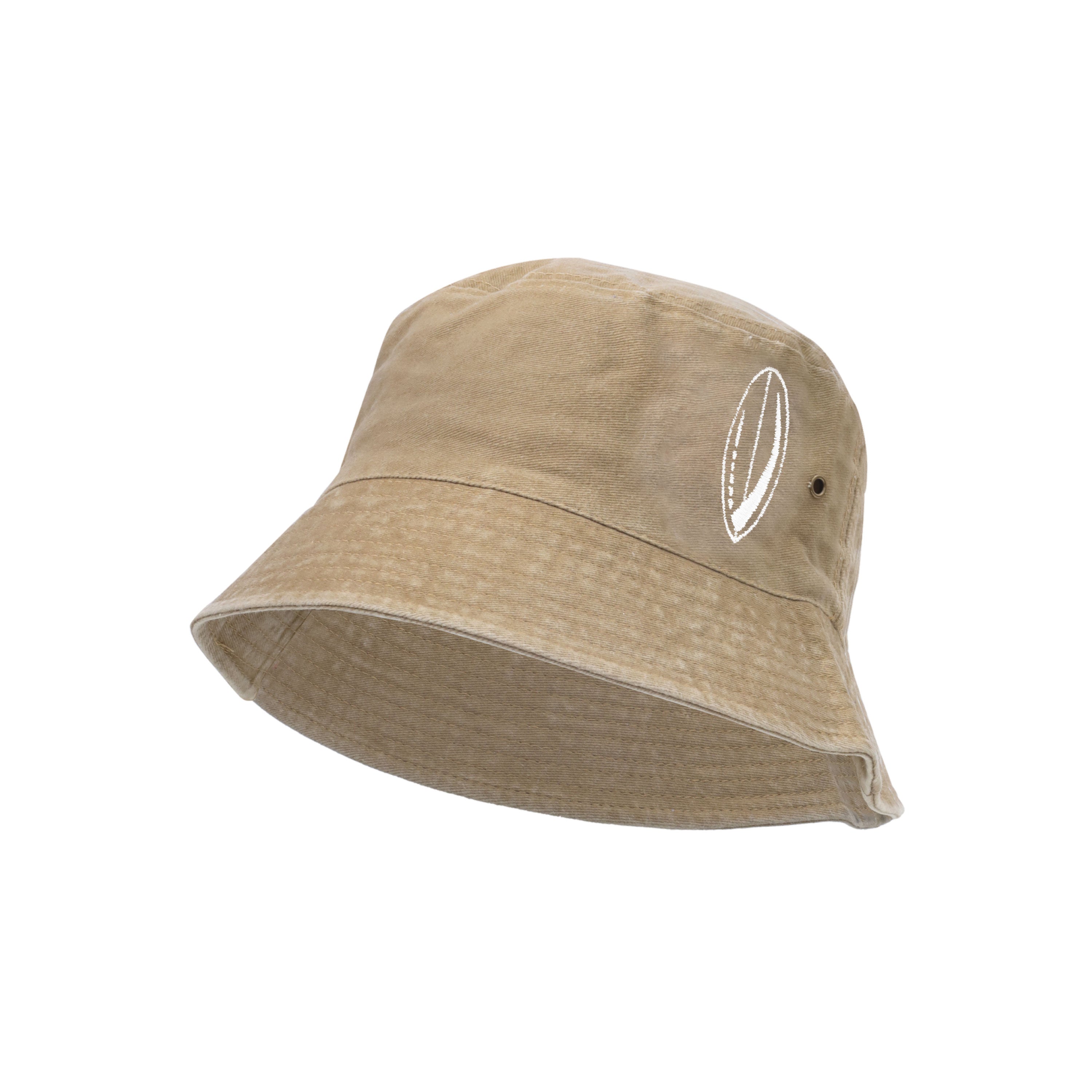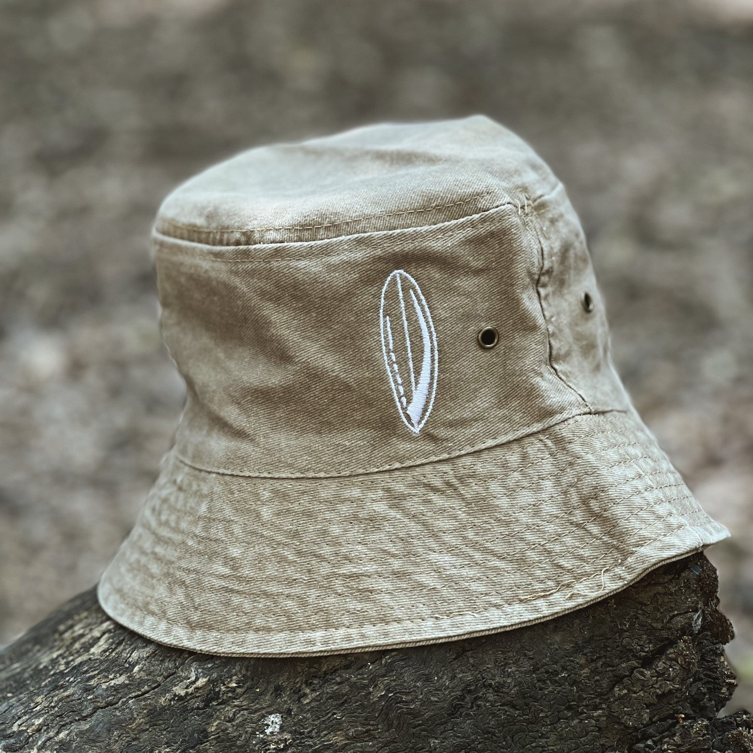 Nuestro bucket hat de la colección Tabla de Surf color beige tiene un diseño tipo "desgastado" y cuentan con dos bordados en color blanco. El primero es el logo de una tabla de surf en la parte delantera izquierda y el segundo es el nombre de la marca en la parte trasera derecha y en pequeño.