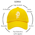 Nuestra gorra de la colección PTguaY color amarillo, está diseñada con dos bordados en color blanco. El primero es el logo PTguaY en el centro y el segundo es el nombre de la marca en la parte trasera del lado izquierdo y en pequeño.