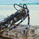Nuestros cuelgalentes étnicos están hechos a mano de hilo con una terminación en color plata y unas gomas elásticas que permiten ajustar el cuelgalentes a cualquier tipo de varilla. Además, cuenta con un distintivo de plata con el nombre de la marca.