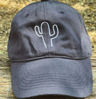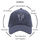 Nuestra gorra de la colección Cactus color azul marino, está diseñada con dos bordados en color blanco. El primero es la silueta de un cactus en el centro y el segundo es el nombre de la marca en la parte trasera del lado izquierdo y en pequeño.