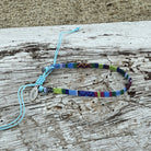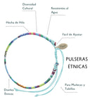 Nuestras pulseras étnicas están hechas a mano, de hilo. Además, cuentan con un distintivo de plata con el nombre de la marca.