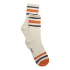 Los calcetines son de color blanco, cuentan con rayas de color gris y naranja, el largo de las calcetas llega hasta mitad de pierna. Tiene el nombre de la marca en la planta del pie en estampado color negro.Son súper agradables al tacto pues son de 100% algodón y tiene un estilo tipo skateboarding/surfer.