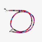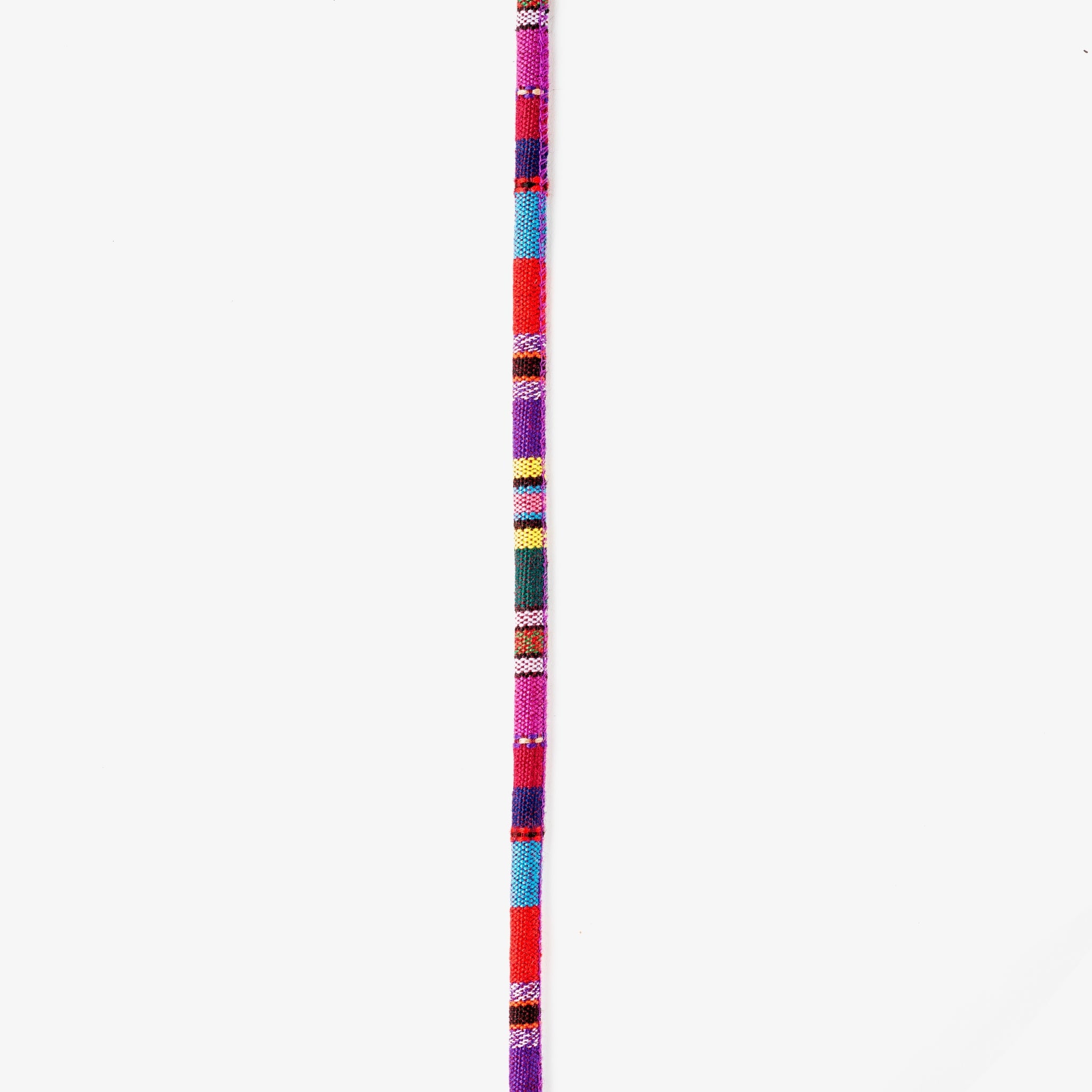 Nuestros cuelgalentes étnicos están hechos a mano de hilo con una terminación en color plata y unas gomas elásticas que permiten ajustar el cuelgalentes a cualquier tipo de varilla. Además, cuenta con un distintivo de plata con el nombre de la marca.