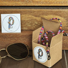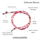 Nuestros cuelgalentes étnicos están hechos a mano de hilo con una terminación en color plata y unas gomas elásticas que permiten ajustar el cuelgalentes a cualquier tipo de varilla. Además, cuenta con un distintivo de plata con el nombre de la marca.