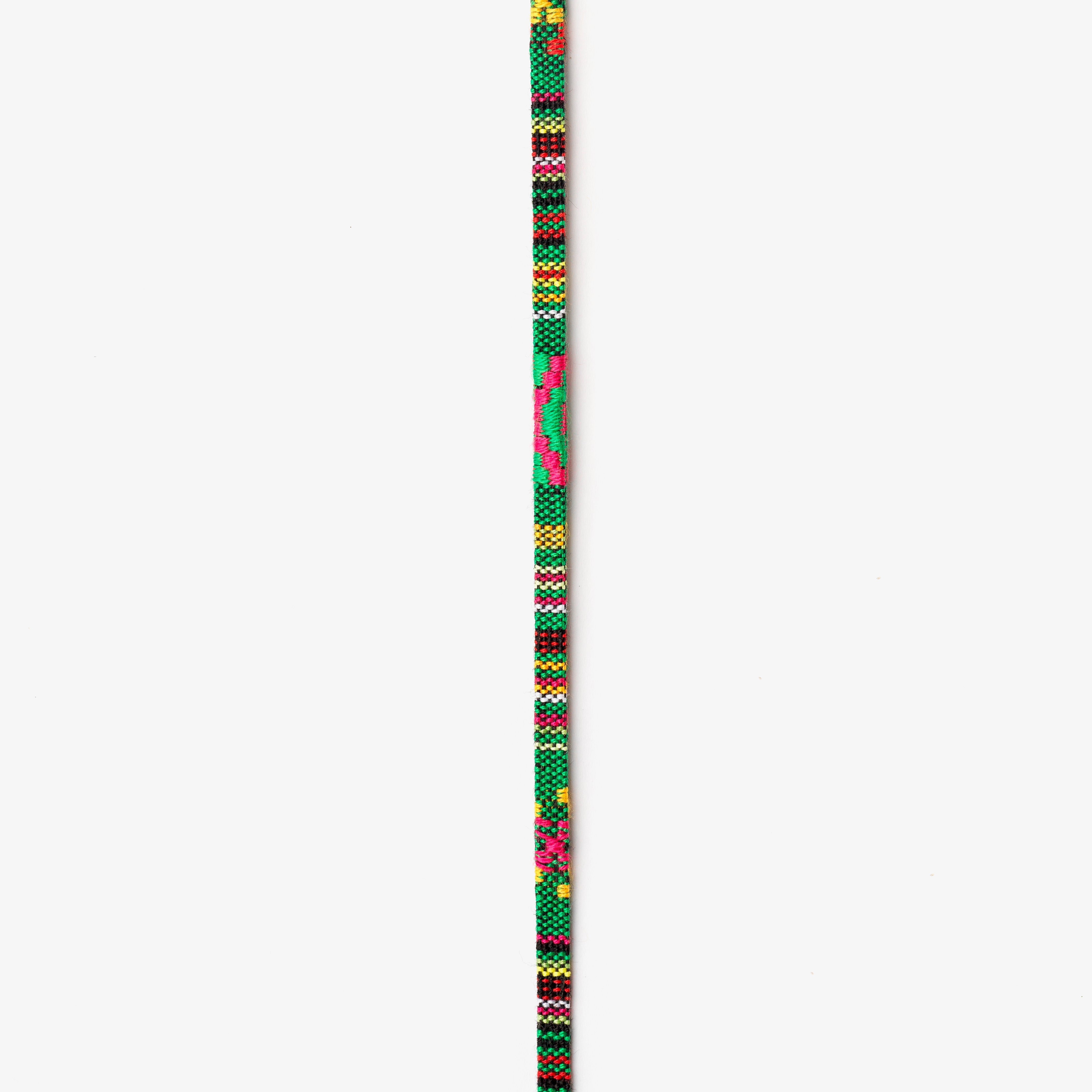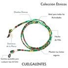 Nuestros cuelgalentes étnicos están hechos a mano de hilo con una terminación en color plata y unas gomas elásticas que permiten ajustar el cuelgalentes a cualquier tipo de varilla. Además, cuenta con un distintivo de plata con el nombre de la marca.