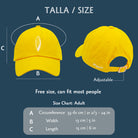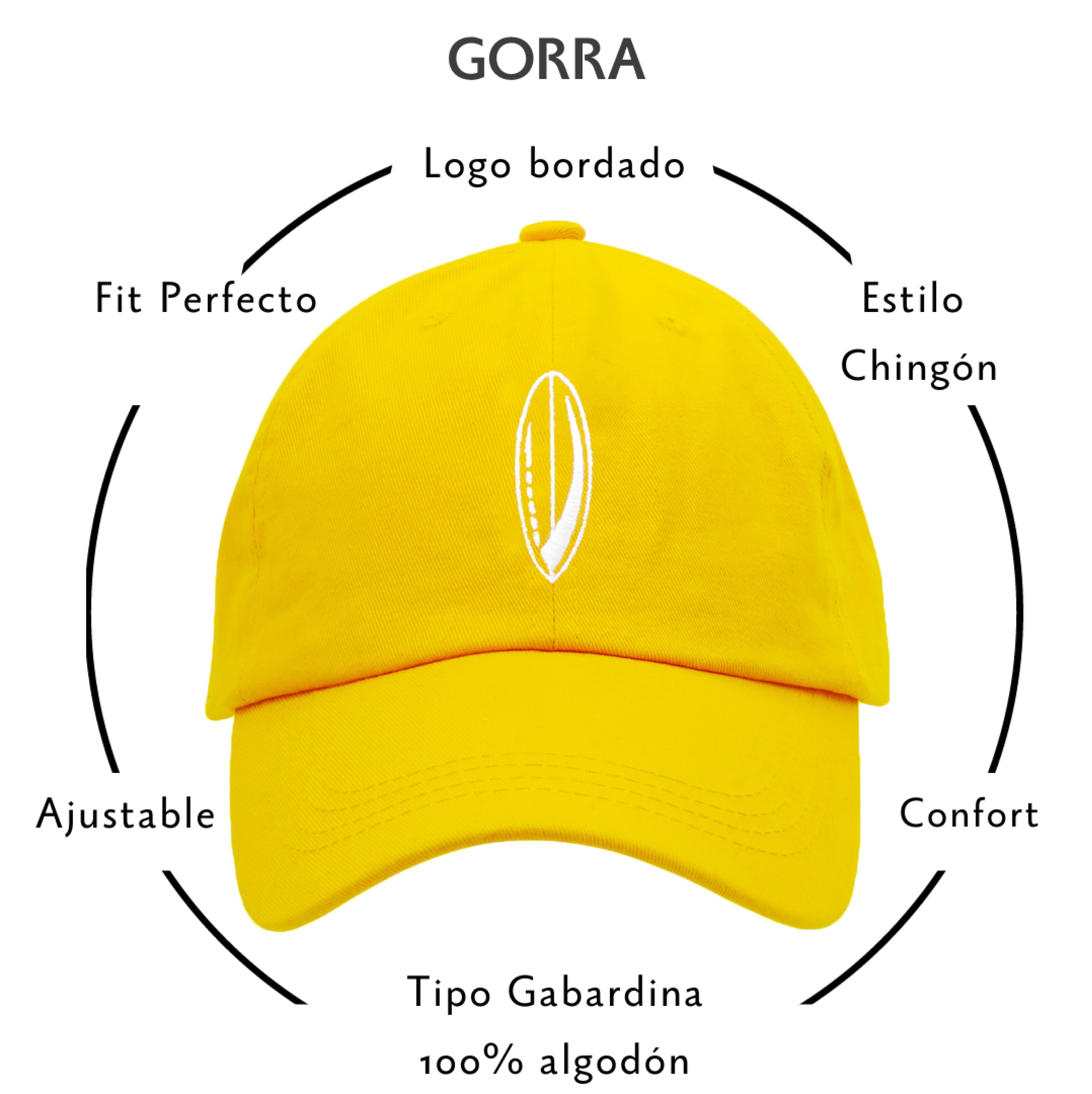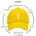 Nuestra gorra de la colección Tabla de Surf color amarillo, está diseñada con dos bordados en color blanco. El primero es el logo de una tabla de surf en el centro y el segundo es el nombre de la marca en la parte trasera del lado izquierdo y en pequeño.