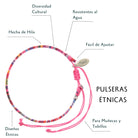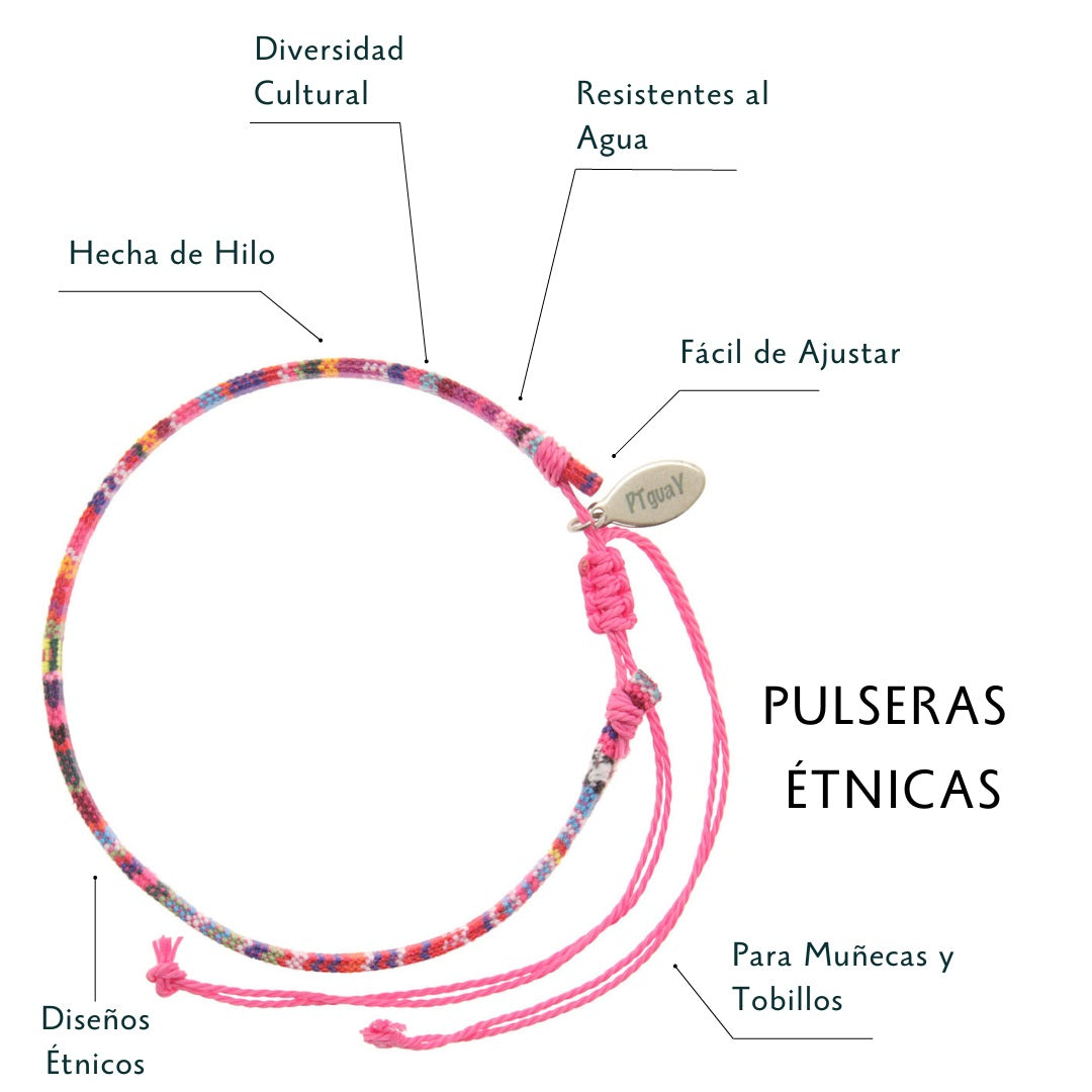 Nuestras pulseras étnicas están hechas a mano, de hilo. Además, cuentan con un distintivo de plata con el nombre de la marca.