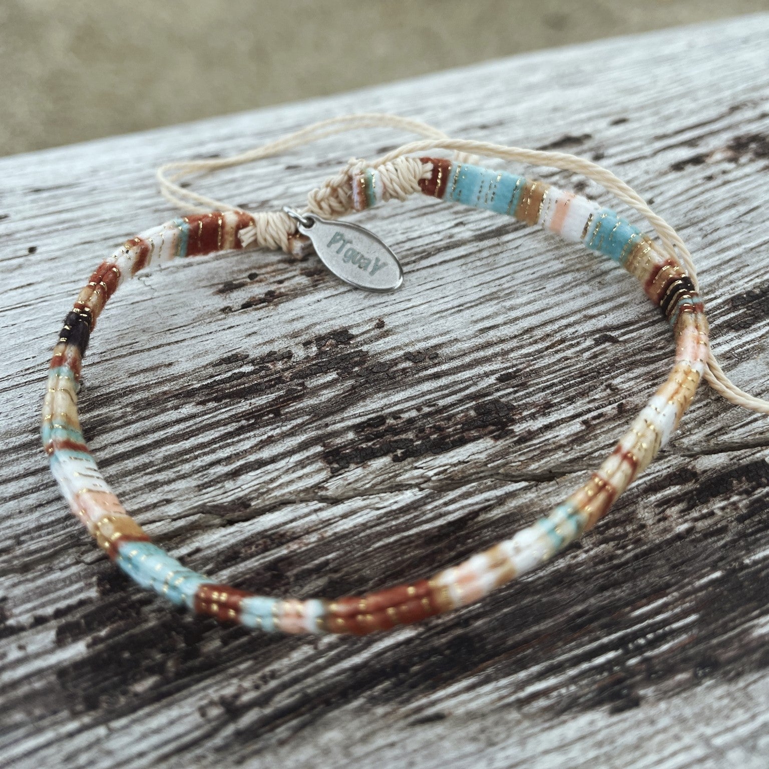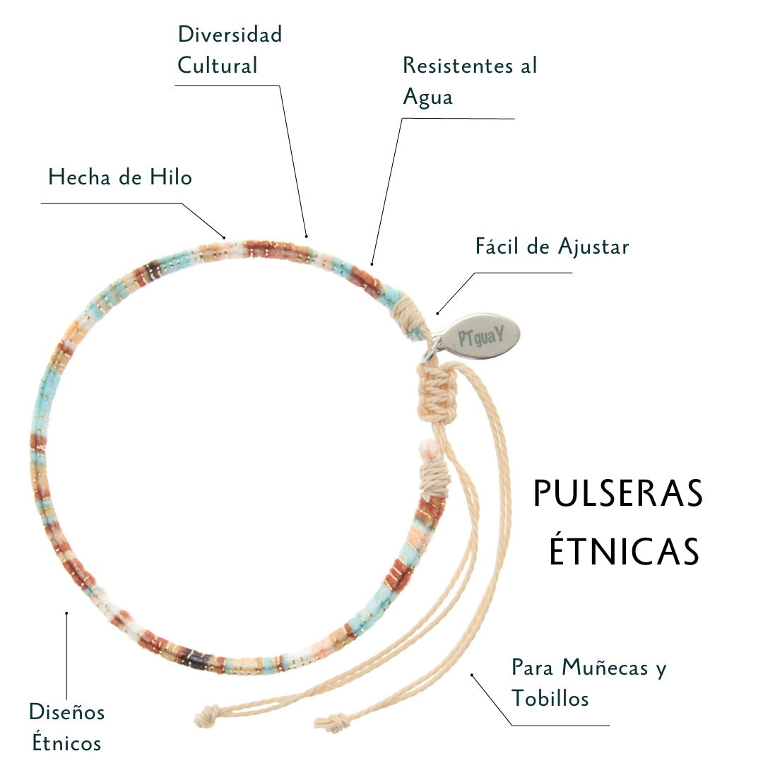 Nuestras pulseras étnicas están hechas a mano, de hilo. Además, cuentan con un distintivo de plata con el nombre de la marca.