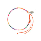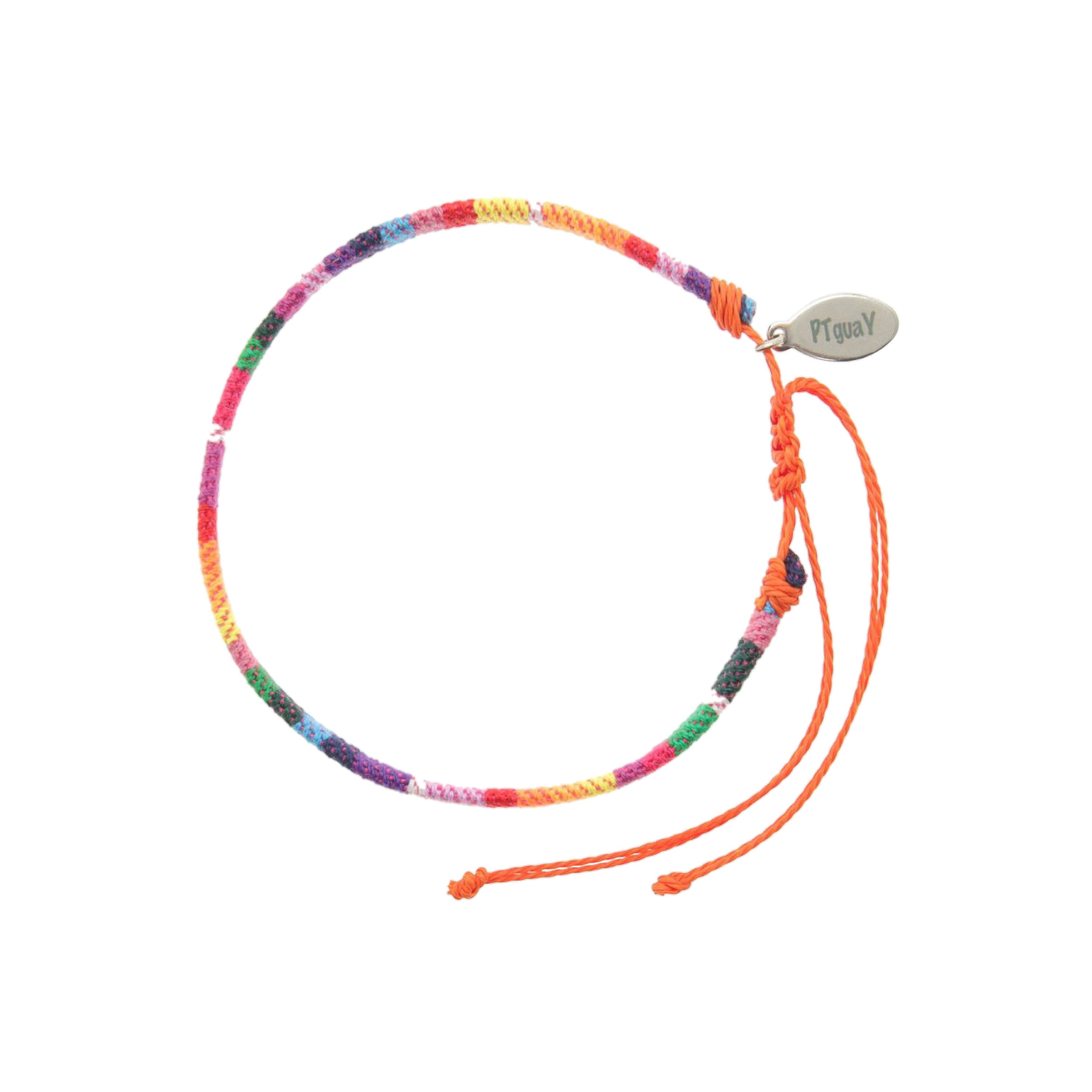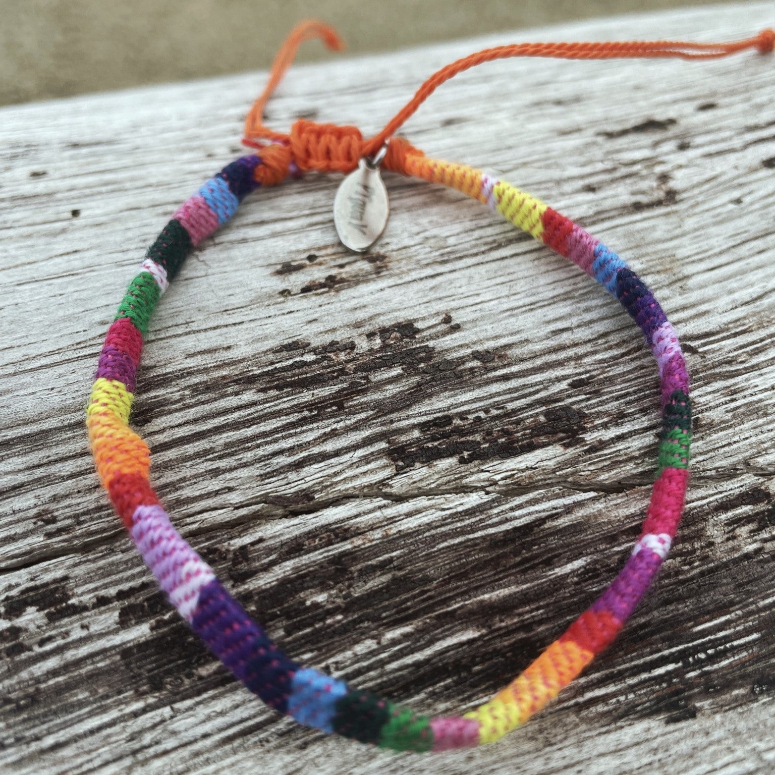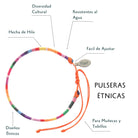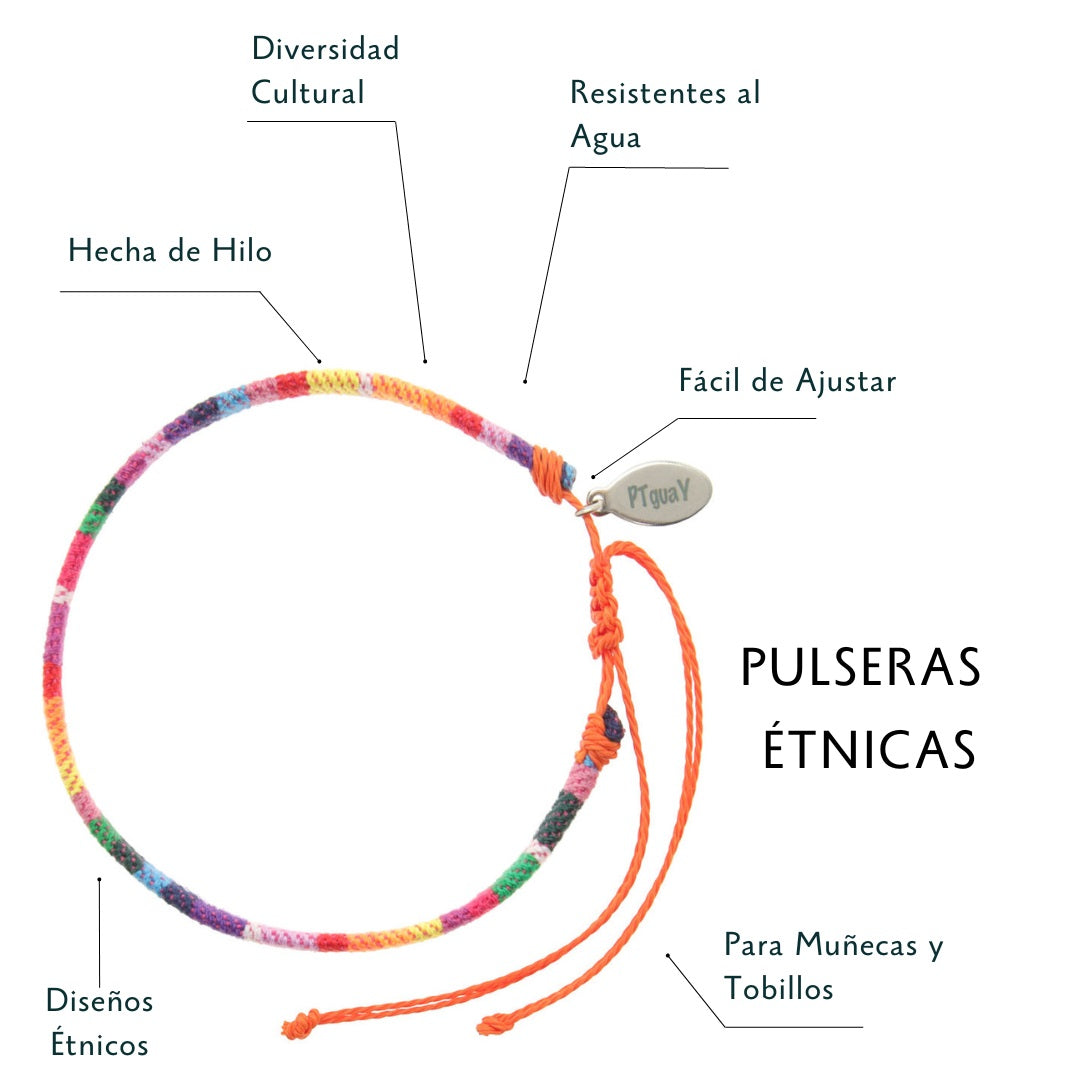 Nuestras pulseras étnicas están hechas a mano, de hilo. Además, cuentan con un distintivo de plata con el nombre de la marca.