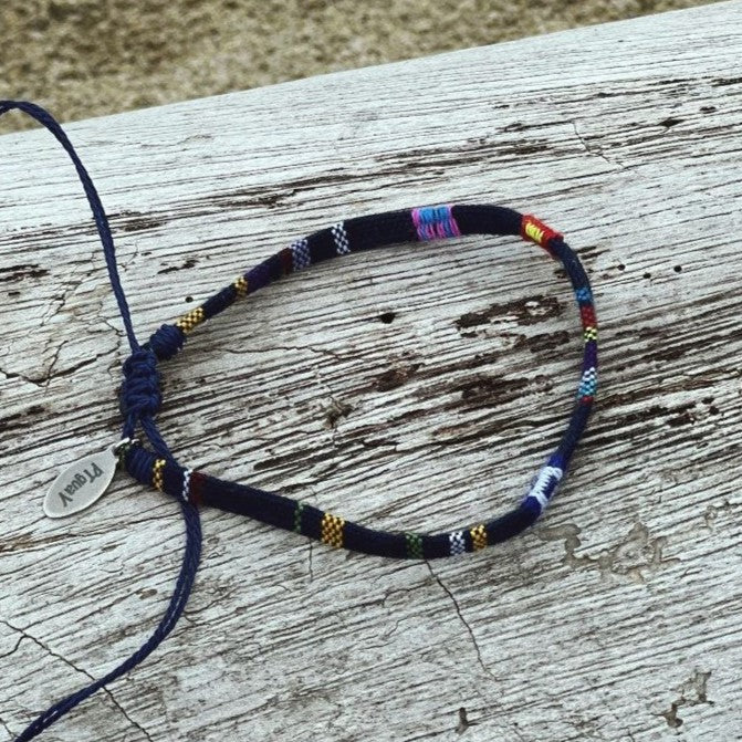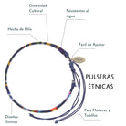 Nuestras pulseras étnicas están hechas a mano, de hilo. Además, cuentan con un distintivo de plata con el nombre de la marca.