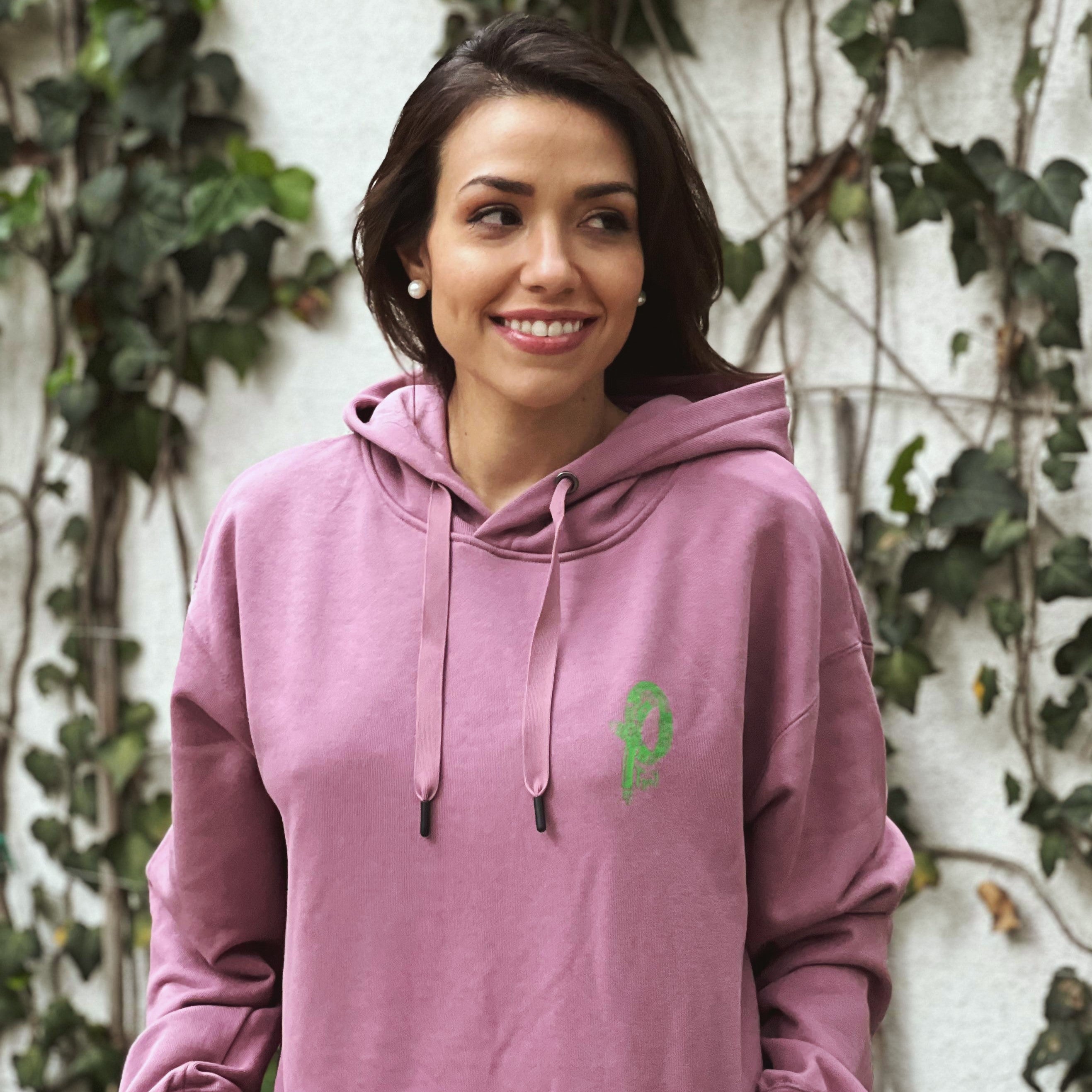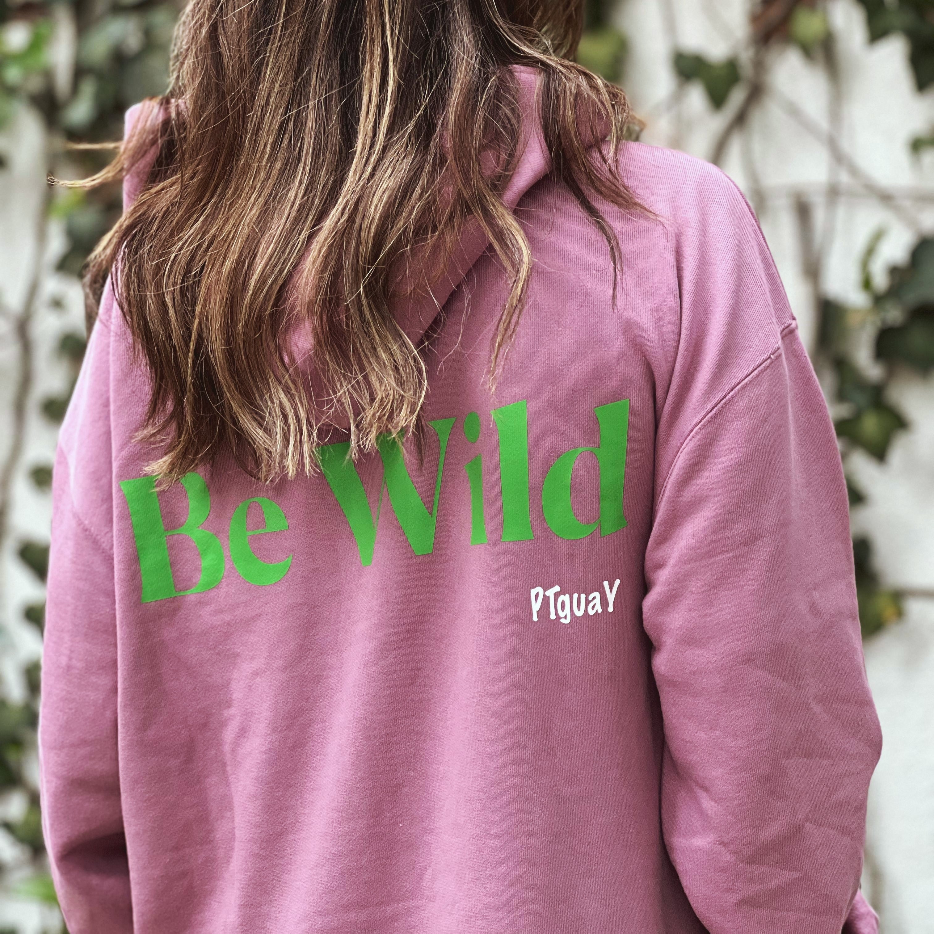Sudadera color salmón con el logo Be Wild en color verde manzana edición limitada.